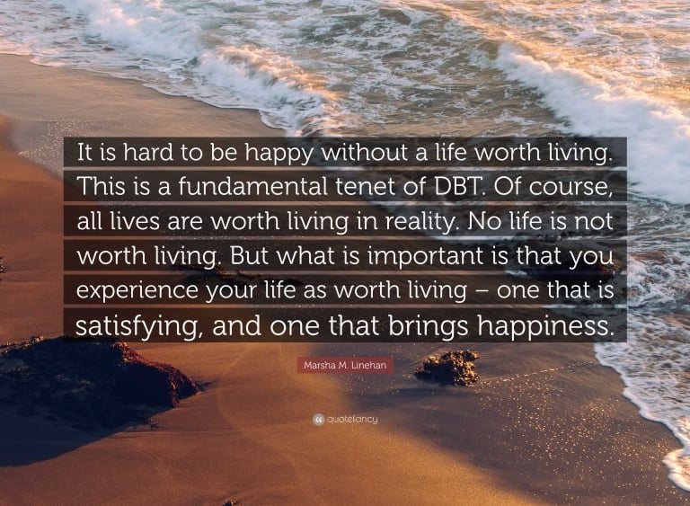 "It is hard to be happy without a life worth living. This is a fundamental tenet of DBT. Of course, all lives are worth living in reality. No life is not worth living. But what is important is that you experience your life as worth living, one that is satisfying, and one that brings happiness.” ― Marsha Linehan